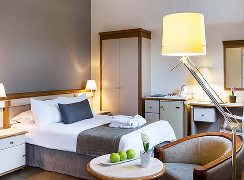 With double bed and charming sleeping amenities, wooden flooring, private balcony facing inland and the city, spacious marble tiled ensuite bathroom and hand shower, luxury toiletries, bathrobes /slippers, double glazed for a total soundproofing, individual climate control, wired and wireless high speed internet access, voice mail, satellite flat screen 32” TV, electronic security lock, electronic safe, wake–up alarm system, Minibar and hairdryer, tea/coffee-making facilities with our compliments.