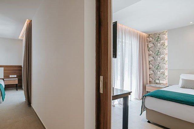 Modern and minimal best describes this room type, as it makes it the ideal type for a family of four. It consists of two rooms one with a double bed and one with twin beds; separate television for each. A spacious wardrobe in each room to fit all customers’ belongings. Beauty desks with lighted mirror providing ease and luxury. These family rooms have furnished terrace with direct pool access.